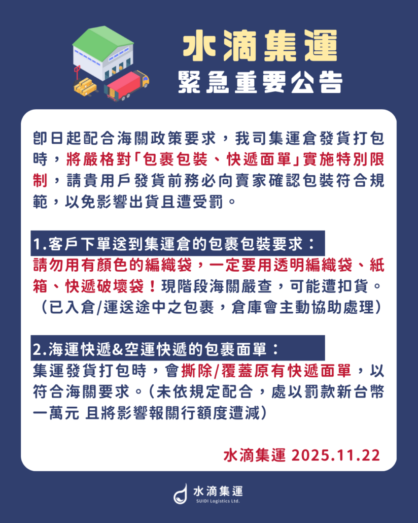 即日起配合海關政策要求,我司集運倉發貨打包時,將嚴格對「包裹包裝、快遞面單」實施特別限制,請貴用戶發貨前務必向賣家確認包裝符合規範,以免影響出貨且遭受罰。